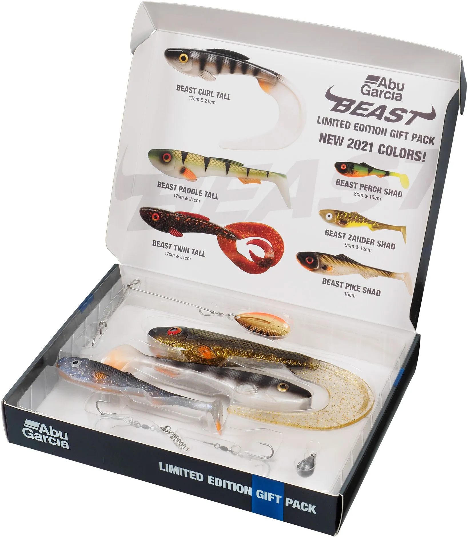 Abu Garcia Beast Limited Edition Gift Pack innehåller tre Beast mjukbeten inklusive de rätta komponenterna för att rigga dem. I lådan finner du en Beast Paddle tail 17cm, en Beast Curl tail 21cm och en Beast Pike shad 16 cm. Betena kommer med en stingerrig som är designad för att passa perfekt på Beast Paddle tail 17cm. Fäst 20 grams vikten i ditt beteslås för att fiska djupare eller addera Instant Spinnerbait (inkluderad i lådan!) för extra attraktion.