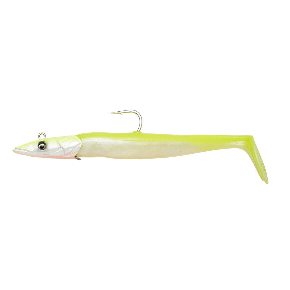 With a lively kicking action on both the drop and the retrieve, this super realistic sandeel imitation will fool even the wariest of predator fish. The unique jig head helps to ensure the lure moves with a perfect rolling and darting action. The Pro Peg body holder makes it possible to peg the body to the head with a toothpick, creating a very simple and secure hold. The soft PVC body comes pre-rigged with an internal glass rattle that gives off a provoking sound to any nearby hunting fish.