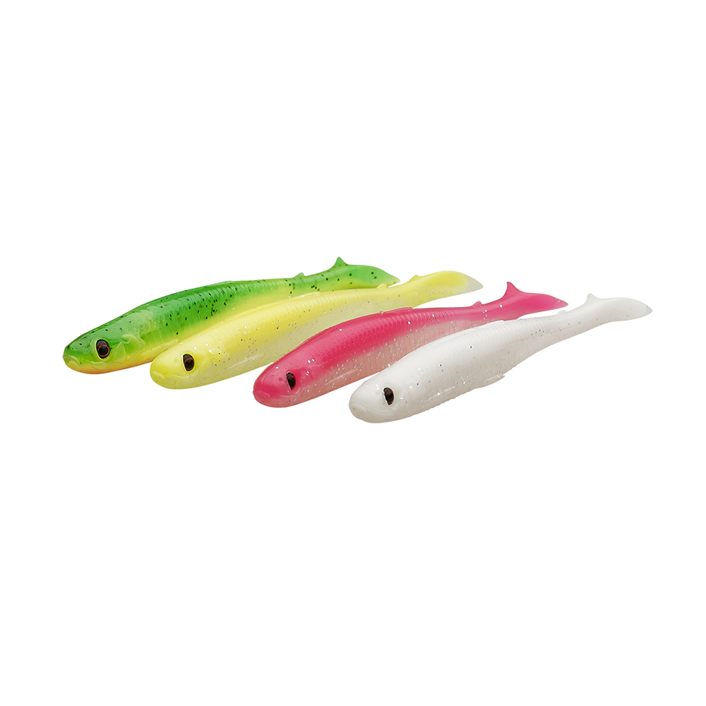A four-pack of the impressive Slender Scoop Shad in colors that work best in dark or murky water conditions: Green Yellow, Lemon Back, Pink Pearl Silver and White Pearl Silver.